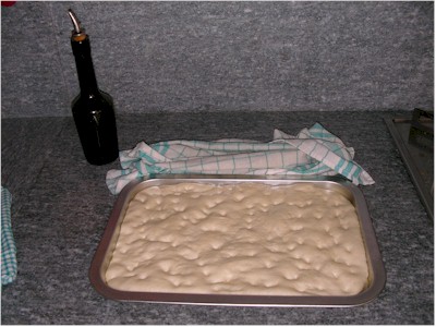 Allargare l'impasto (non reimpastare) con le mani e sulla sulla madia, poi nel tegame unto, shiacciando forte con i polpastrelli per formare le caratteristiche "fossette". La pasta dovrà avere uno spessore di circa mezzo centimetro.
