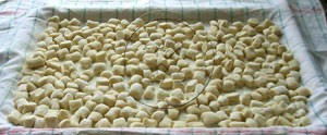 Formare dei bastoncini della grossezza di un dito e tagliarli a tocchetti di circa 2 centimetri. Disporli su un vassoio infarinato e copargerli via via di farina per evitare che si attacchino fra loro.