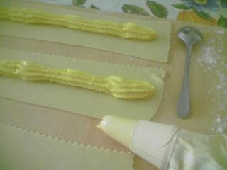 Ritagliate da ogni sfoglia 2 striscie ( lunghe all'incirca 30cm e larghe 6cm ca) e, con un cucchiaino o con la sac à poche, mettete la ricotta condita. Rialzate i bordi e formate una spirale, cercate di "chiudere" bene la parte finale, aiutandovi con le dita inumidite d'acqua se la sfoglia risultasse troppo asciutta.