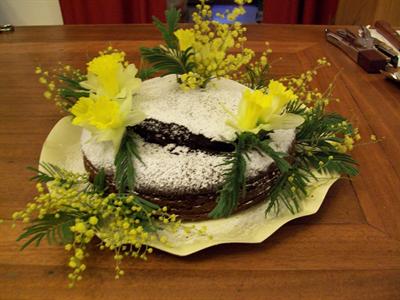 Appena freddo spolverare con zucchero a velo e poi nel mio caso ho aggiunto narcisi e mimosa. I gambi dei fiori li ho fasciati in fondo con un pochino di stagnola e poi inseriti liberamente a decorare.