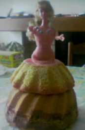 Prima, però, ricoprite il corpino della bambola con la pasta di mandorle, pressando bene( vi sarà molto utile una spatolina).Preparate anche 2 sfoglie di pasta da cui ritaglierete le "gonne", posandole sulle torte e modellando con cura. A questo punto non resta che assemblare il tutto, infilando la bambola nel foro centrale (fatte un volant- nasconditutto!), ponendo poi la 2 torte sulla base...